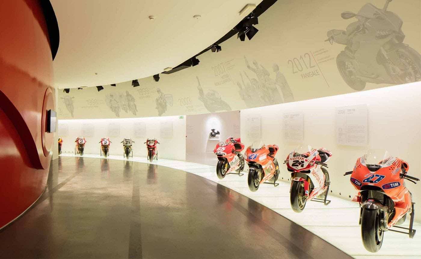 Σε έναν τεράστιο κυρτό διάδρομο η Ducati μας επιδεικνύει την εξέλιξη των μηχανών της με την προβολή 15 μηχανών από το 1946 έως σήμερα. Επιπλέον έχει δημιουργήσει ένα προσεγμένο χρονοδιάγραμμα γεγονότων, ανθρώπων και τεχνολογικών καινοτομιών που αντιπροσωπεύουν τα ορόσημα της ιστορίας της εταιρίας από τότε που ξεκίνησε το 1926.