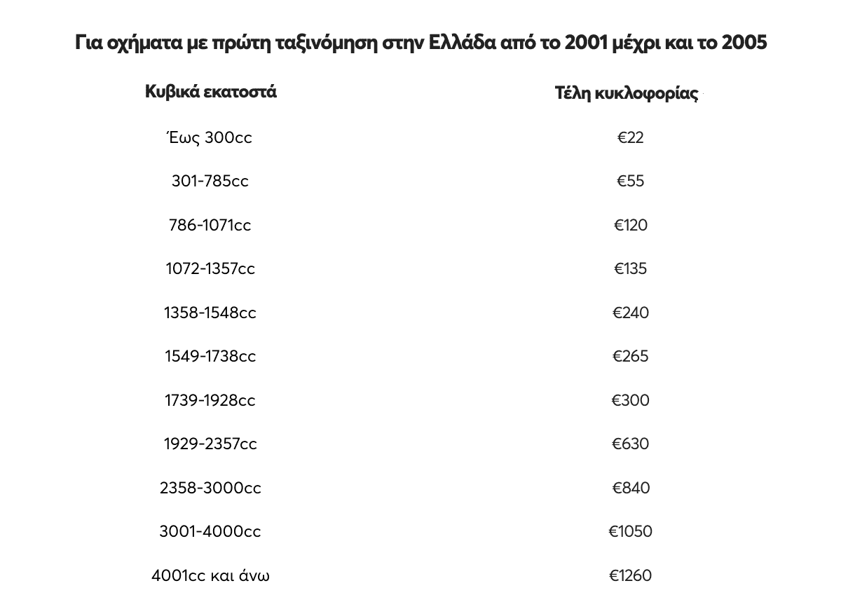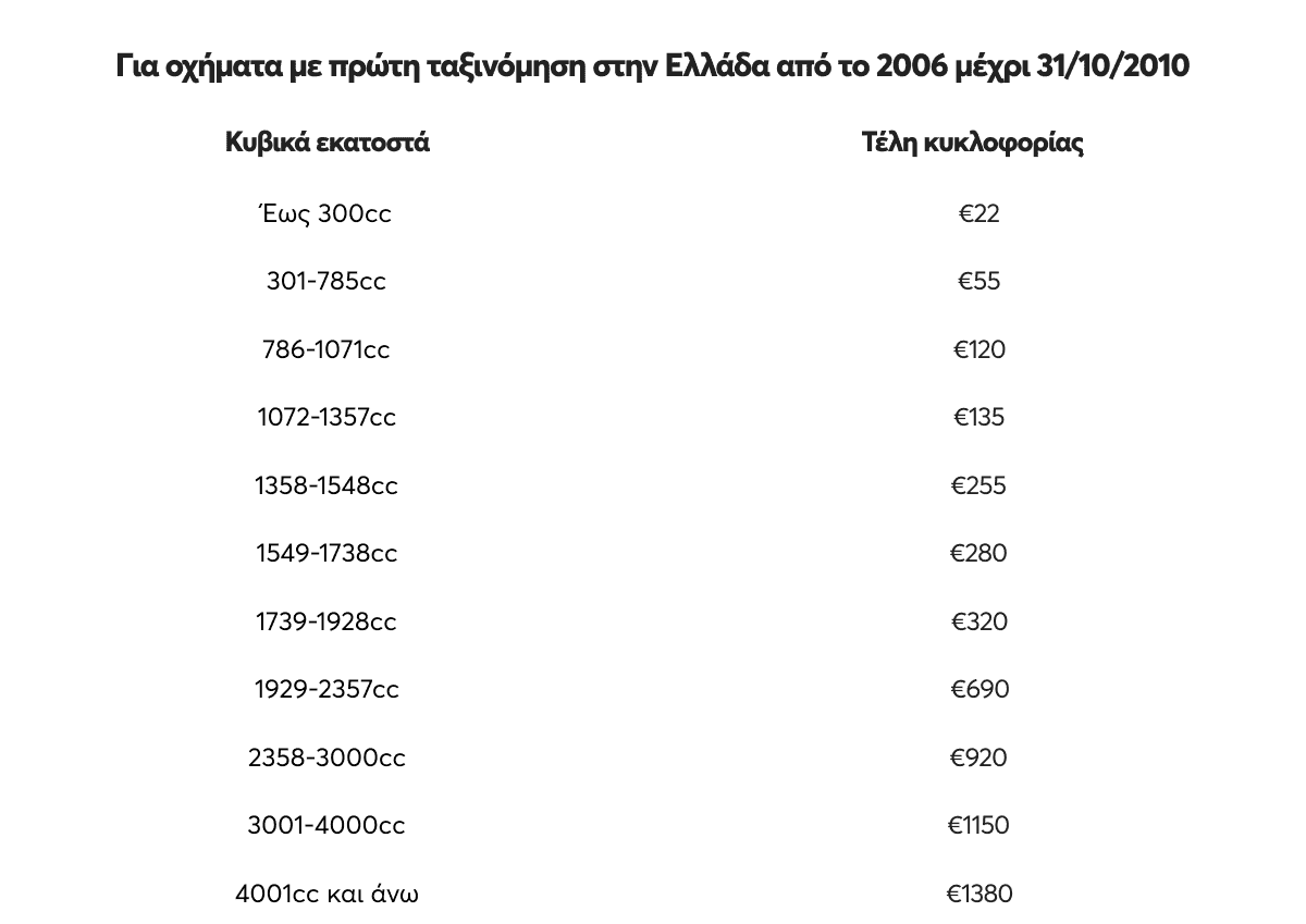 Κανένα φοβερό νεό εδώ, τα ποσά είναι ίδια με πέρσι. Για οχήματα με ημερομηνία πρώτης ταξινόμησης έως το 2010, τα τέλη κυκλοφορίας υπολογίζονται με βάση τον κυβισμό.