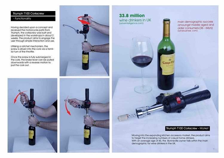 Να, πώς ένας μοχλός φρένων, μπορεί να μετατραπεί σε ένα ανοιχτήρι κρασιών, το επονομαζόμενο τιρμπουσόν. Ο μοχλός συνεχίζει να χρησιμοποιείται για έλεγχο του εξαρτήματος, όχι πλέον της μηχανής όμως, αλλά του ανοιχτηριού. Παράλληλα, η επανατοποθετημένη λαβή κρατάει ακόμη πάνω της τα κουμπιά και τα φώτα της αρχικής λαβής τιμονιού της μοτοσυκλέτας! Ανοίγεις το κρασί σου με άπειρο coolness.
